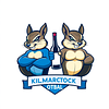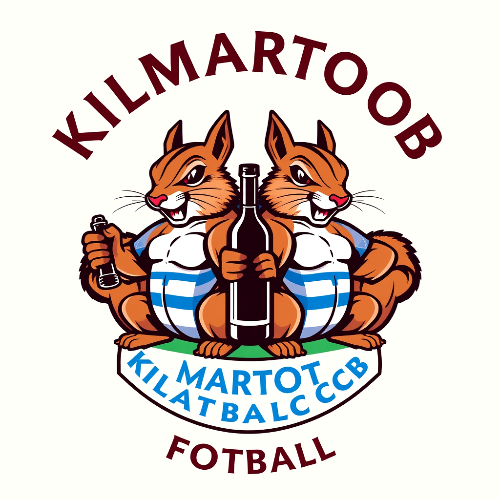 Kilmarnock football club crest. Two angry looking squirrels with muscles, one holding a bottle of wine