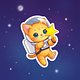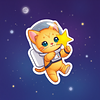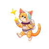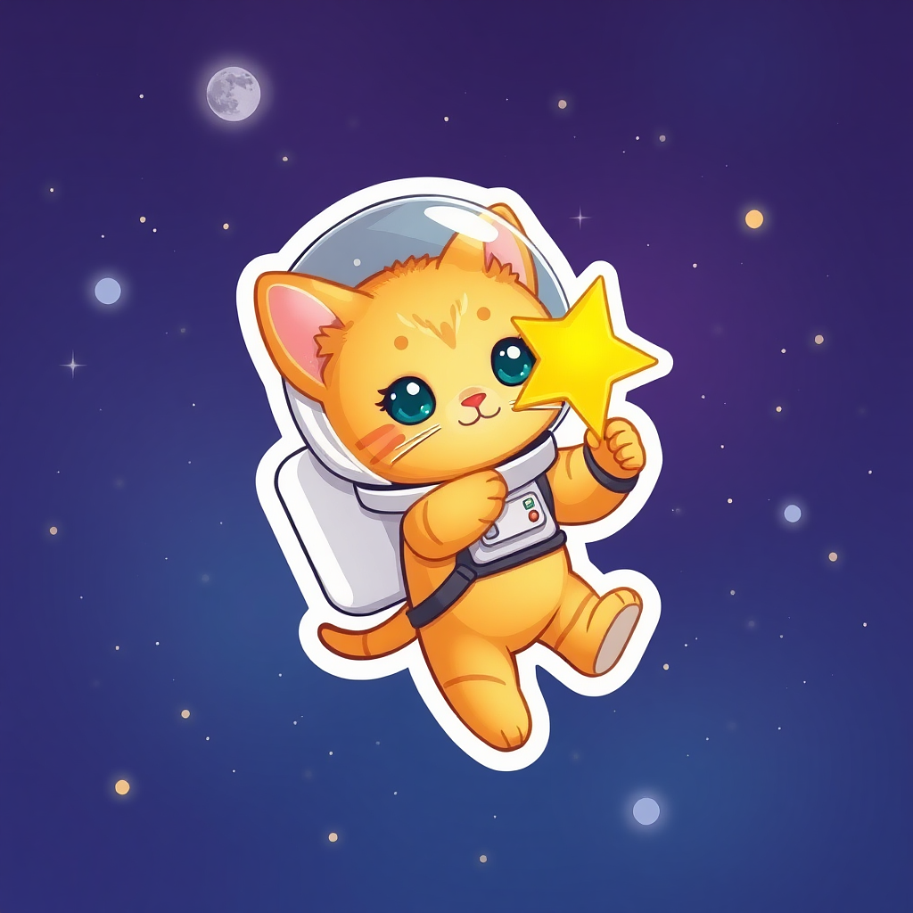 Un sticker de un pequeño gato naranja con un traje de astronauta blanco y detalles celestes, flotando en el espacio y sosteniendo una estrella brillante. Estilo ilustración digital plana, bordes blancos gruesos, colores vibrantes, fondo blanco sólido, alta resolución, 4k.