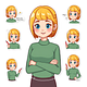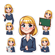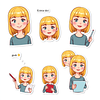 Create a unique sticker pack based on my photo. My name is Kristina Smolina, and I am a primary school teacher. All the stickers should be recognizable and convey my personality, while still being stylized and easy to use in chats. Criteria: 1. The main reference is the attached photos. 2. Style: cartoonish with a transparent background. 3. Quantity: 8 stickers with different emotions and actions. What to reflect in the stickers: Appearance : fair skin, medium yellow hair with a bee hairstyle and straight bangs, blue eyes - Character: calm, loves his job. Additionally: Add funny captions: "good girl" "well done" "keep it up" "excellent" "you can do better" "unreadable" "live through And" "write carefully" and others. You can use accessories (a red pen, a pointer, chalk, a cup of coffee, a magazine) or meme elements, but so that Smolina Kristina remains herself. Everything should be done in Russian and in a calm, non-cartoonish style. 4x5 format.