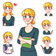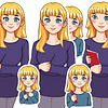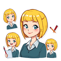 Create a unique sticker pack based on my photo. My name is Kristina Smolina, and I am a primary school teacher. All the stickers should be recognizable and convey my personality, while still being stylized and easy to use in chats. Criteria: 1. The main reference is the attached photos. 2. Style: cartoonish with a transparent background. 3. Quantity: 8 stickers with different emotions and actions. What to reflect in the stickers: Appearance : fair skin, medium yellow hair with a bee hairstyle and straight bangs, blue eyes - Character: calm, loves his job. Additionally: Add funny captions: "good girl" "well done" "keep it up" "excellent" "you can do better" "unreadable" "live through And" "write carefully" and others. You can use accessories (a red pen, a pointer, chalk, a cup of coffee, a magazine) or meme elements, but so that Smolina Kristina remains herself. Everything should be done in Russian and in a calm, non-cartoonish style. 4x5 format. Add to stickers:"Отлично", "Хорошо","Старайся" , " Ты можешь лучше"